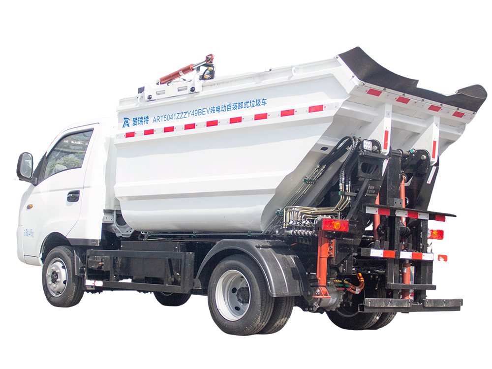 ART5041ZZZY49BEV純電動自裝卸式垃圾車采用后置翻桶機構上料,高位傾翻垃圾箱卸料的生活垃圾收運車,能夠同時滿足兩個標準垃圾桶同時上料,?作業效率極高,?適合城市小區、主次干道和沿街標準垃圾桶的收運,同時可以與大型純電動壓縮式垃圾車進行車車對接。