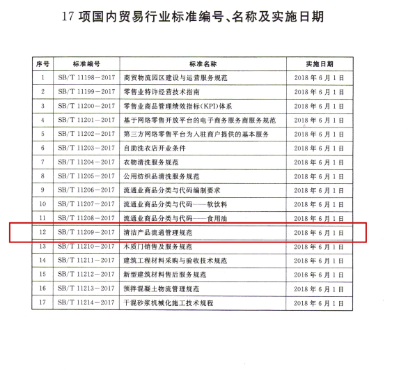 該標準編號為SB/T 11209-2017,由中清凈業(北京)環境科技研究院、安徽愛瑞特環保科技股份有限公司主持起草。標準規定了清潔產品流通過程的術語和定義、總體要求、包裝、標識、倉儲和運輸、采購、銷售管理和售后服務等相關要求。將適用于清潔產品的研發機構、生產企業、經銷企業及綜合性企業的經營活動和建筑物清潔、市政環境清潔、工業清洗與凈化等服務領域的采購活動。作為清潔產品流通領域唯一的一部行業標準,從最初的立項、起草、公布到實施,可以說每一步推進,都吸引著整個行業的目光。