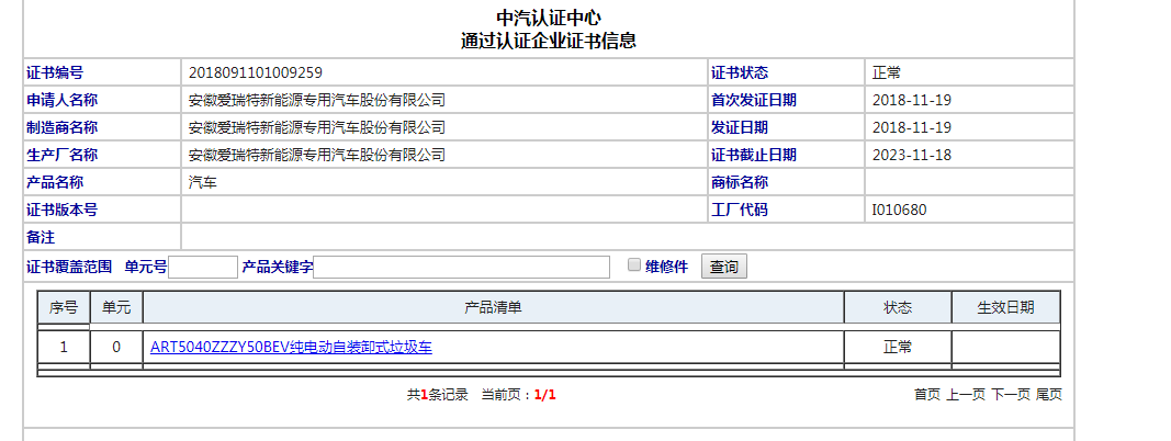近期,經(jīng)中汽認(rèn)證中心認(rèn)證,安徽愛瑞特新能源專用汽車股份有限公司(以下簡稱愛瑞特)旗下ART5040ZZZY50BEV車型通過強(qiáng)制性產(chǎn)品認(rèn)證,即國家3C認(rèn)證,取得了該領(lǐng)域市場的準(zhǔn)入資格。這標(biāo)志著愛瑞特研發(fā)的新能源環(huán)衛(wèi)專用汽車在新能源汽車行業(yè)前進(jìn)了一大步,正式邁入批量生產(chǎn)、投放市場階段。ART5040ZZZY50BEV型純電動(dòng)自裝卸式垃圾車節(jié)能減排、經(jīng)濟(jì)實(shí)用、操控簡單,起步快行駛穩(wěn)定,噪音低安全性高,既為城市垃圾清潔行業(yè)降低了運(yùn)營成本,又減少了城市空氣污染指數(shù);既提升了城市居民的生活質(zhì)量,又推進(jìn)了綠色城市的健康建設(shè)。